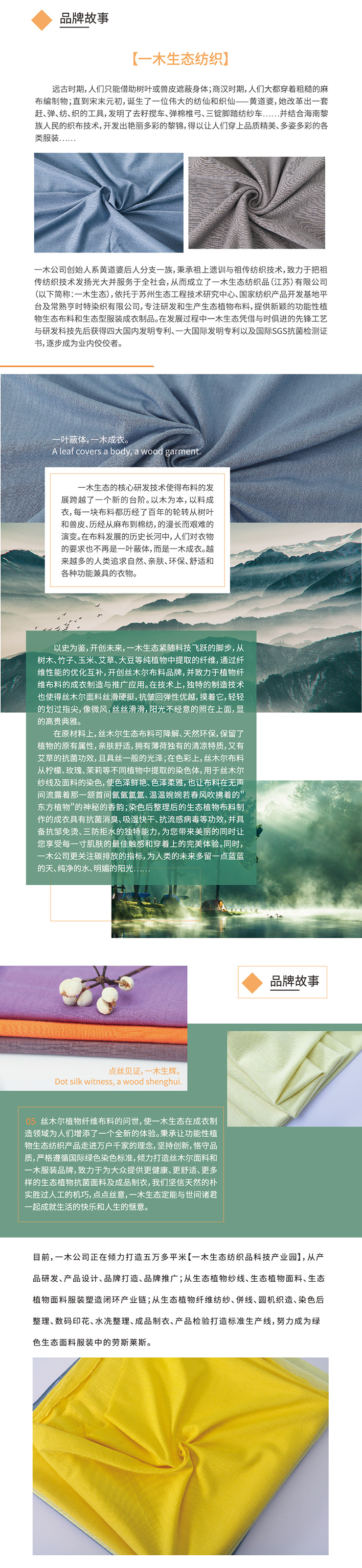 一木生態(tài)紡織產(chǎn)品應(yīng)時(shí)代需求以及人們對(duì)天然環(huán)保服裝的渴求而誕生公司以蘇州生態(tài)工程技術(shù)研究中心為基地以一木生態(tài)紡織品科技產(chǎn)業(yè)園為依托,以研發(fā)、生產(chǎn)、銷(xiāo)售(電子商務(wù)平臺(tái)及跨境電商)新型功能性生態(tài)紡織產(chǎn)品為己任,產(chǎn)品全部采用天絲、莫代爾、竹纖維、玉米纖維、玫瑰、薄荷等新型纖維素纖維(植物纖維)。創(chuàng)新之道,本在惠人,一木人將永遠(yuǎn)秉承歷史寶貴經(jīng)驗(yàn),在新的時(shí)代與君開(kāi)創(chuàng)新的紀(jì)元。
